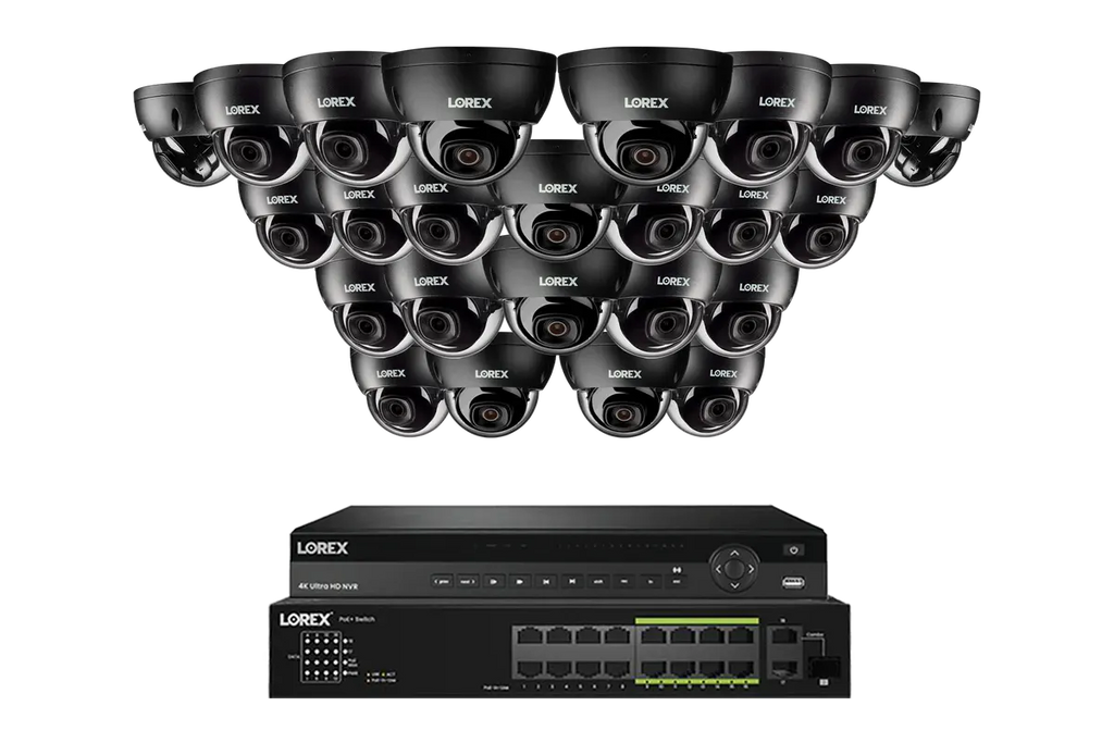 The Lorex Elite Series delivers enterprise-grade surveillance with 4K resolution and 6TB storage capacity, supporting up to 32 cameras for comprehensive site coverage. Featuring vandal-proof 8MP IP dome cameras with color night vision, this wired NVR system maintains clarity in low-light conditions without compromising detail. IP67-rated construction ensures durability against dust and water intrusion in demanding environments. Available in black and white finishes to match your facility's aesthetic. Ideal for businesses requiring reliable, scalable security infrastructure with professional-grade imaging and robust protection.